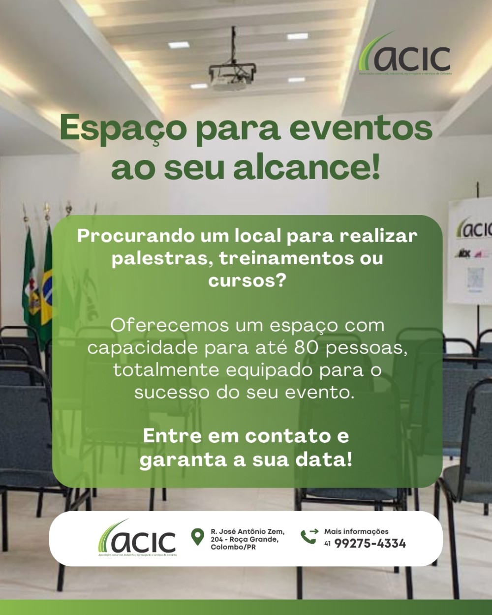 A ACIC disponibiliza, para locação, seu Salão de Eventos com capacidade para 80 pessoas, espaço amplo, ar condicionado, cozinha equipada...ideal para realização de Jantar, Almoço, Coquetel e Palestras.